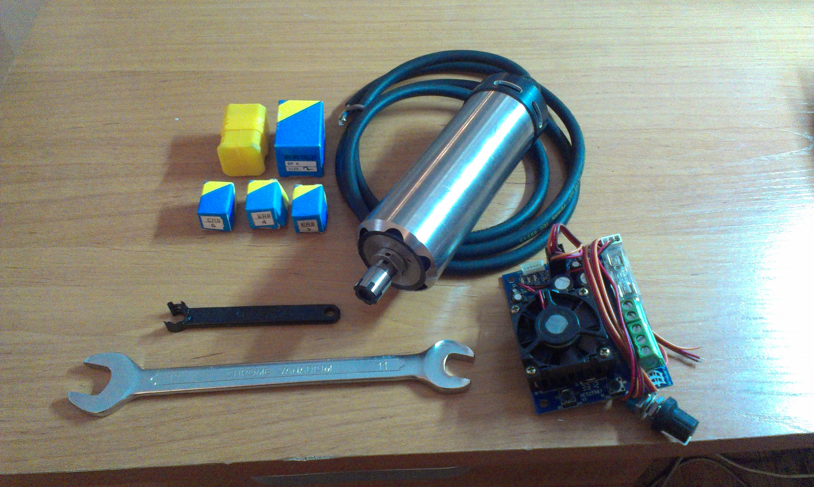 Продаю два шпинделя первая модель: WINDWARD-S4525 новый высокоскоростной без щеточный шпиндель с оборотами до 40000 об/мин мощностью 300W с воздушным охлаждением не большого размера весом 1 кг и цанговым зажимом инструмента ER8 от 1мм до 5мм с новыми радиально упорными подшипниками NSK. В комплект входит шпиндель, инвертор, 5шт цанг ER8 от 1 до 5мм, 2 ключа. ЦЕНА: 20000 рублей
