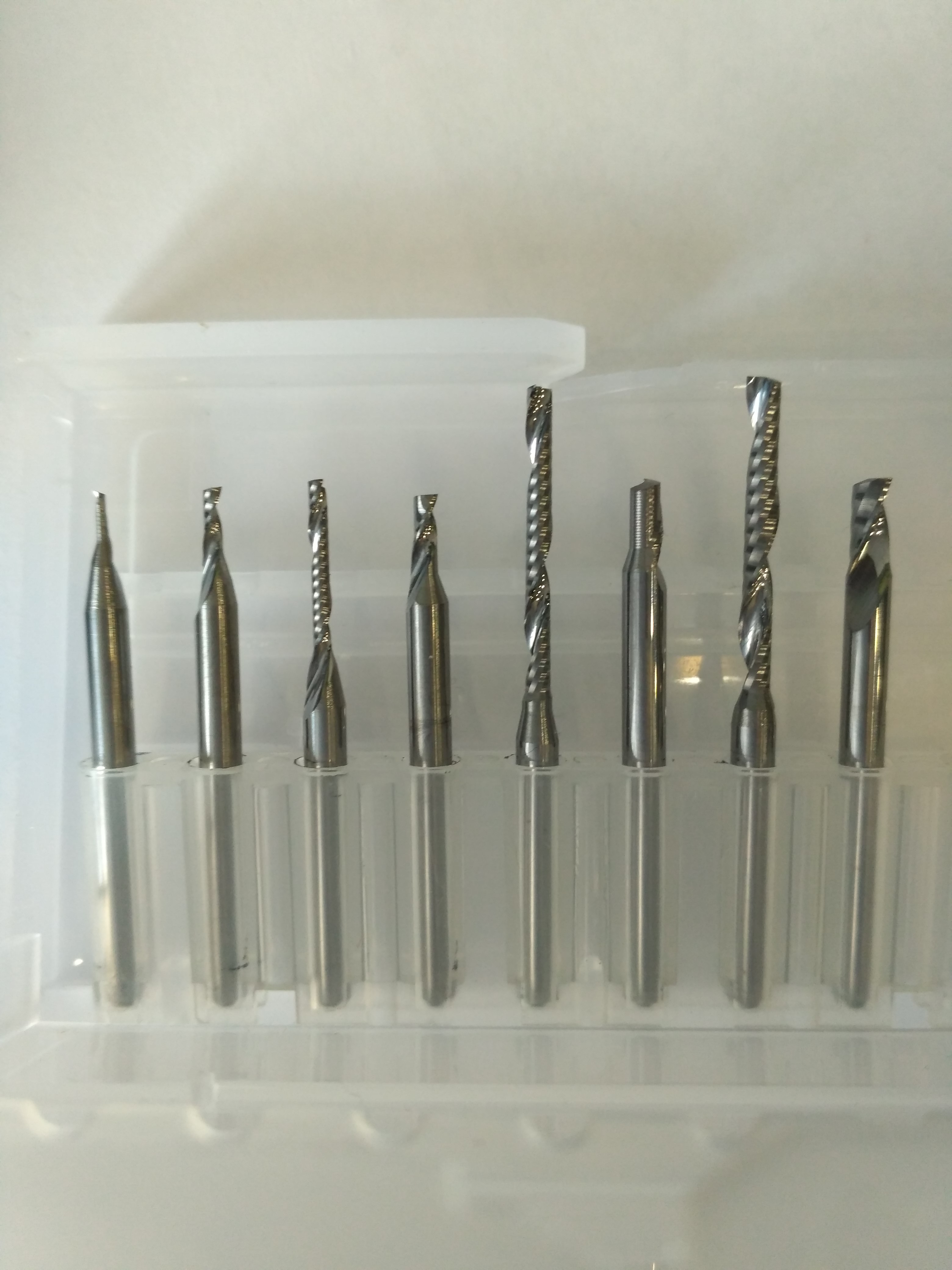 Китайские бюджетные фрезы, хвостовик 3.175. Для воска, пластика, цветмета. Как правило выбраны самые длинные из доступных и самые короткие... (к сожалению, часть в пути потерялась)