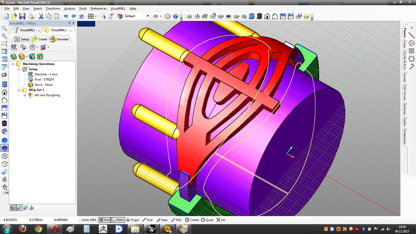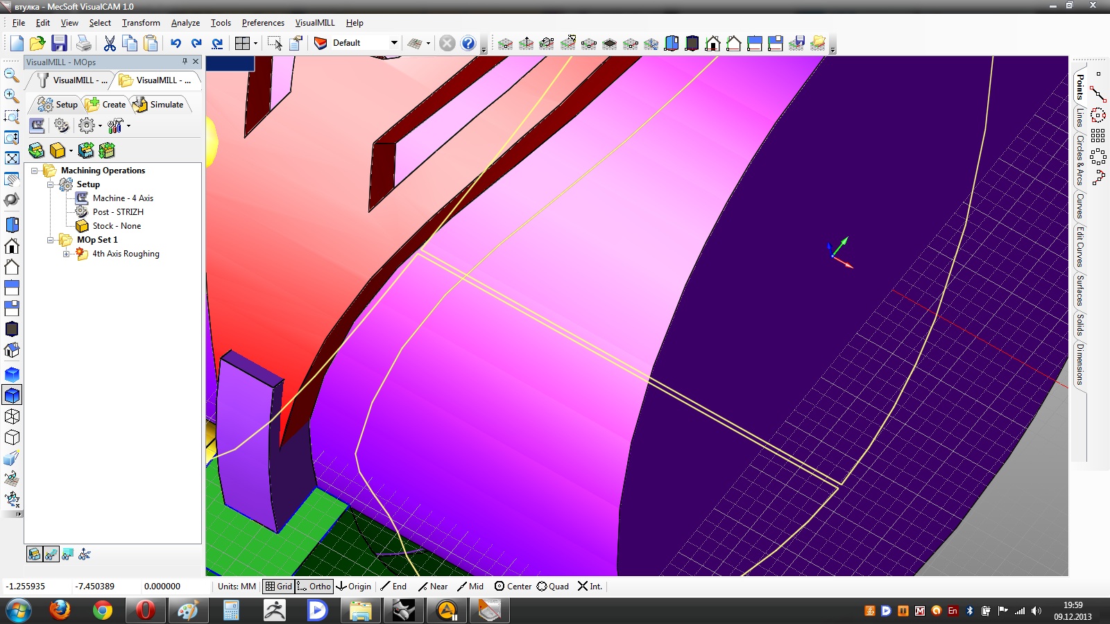 на 4axes paralell finishing когда отмечаешь зону обработки пишет что "неправильно указан регион" ( по кругу, то бишь по кромке кольца)и не считает. если кольцо прямое проблем нет. а если оно выгнутое??? РК2012 может только предложить проекцию фрезы на изделие , т.е. по воздуху будь здоров гоняет. лишнего конечно не срежет , но на фиг надо столько времени терять-так не должно же работать